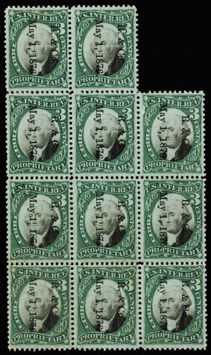 Lot 4032 - PROP. - MULTIPLES (RB3b) BL/11, PC, "R. & Co. May 1, 1876", sm. thin on one stamp, deep dark color, fresh and F-VF, a extremely rare multiple with a printed cancel.