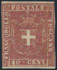 Lot 3782 - TUSCANY 21, Scarce 40¢ Carmine, intensely rich colour, fresh, F, OG. Has 1971 A. Diena Certificate. A NICE EXAMPLE OF THIS RARITY....18,000.00