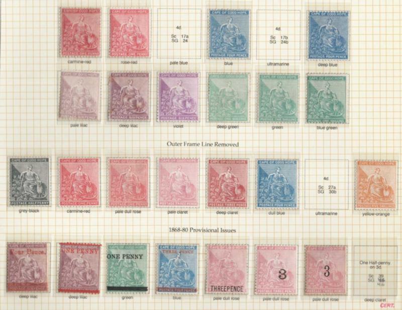 Lot 9205 - Cape of Good Hope CAPE OF GOOD HOPE, 1864-1902 REMARKABLE COLLECTION OF MINT ISSUES, #16//62, virtually complete with a number of extra shades as listed in Scott and Gibbons, each stamp selected for centering and freshness, a few highlights incl. beautiful singles of all the 5sh values incl. all the listed shades for the last issue, numerous stamps in the $200-300 cat. value range, overall very fine, a most unusual opportunity to acquire collection of such completeness, cat. $10,645.00....US$2,000