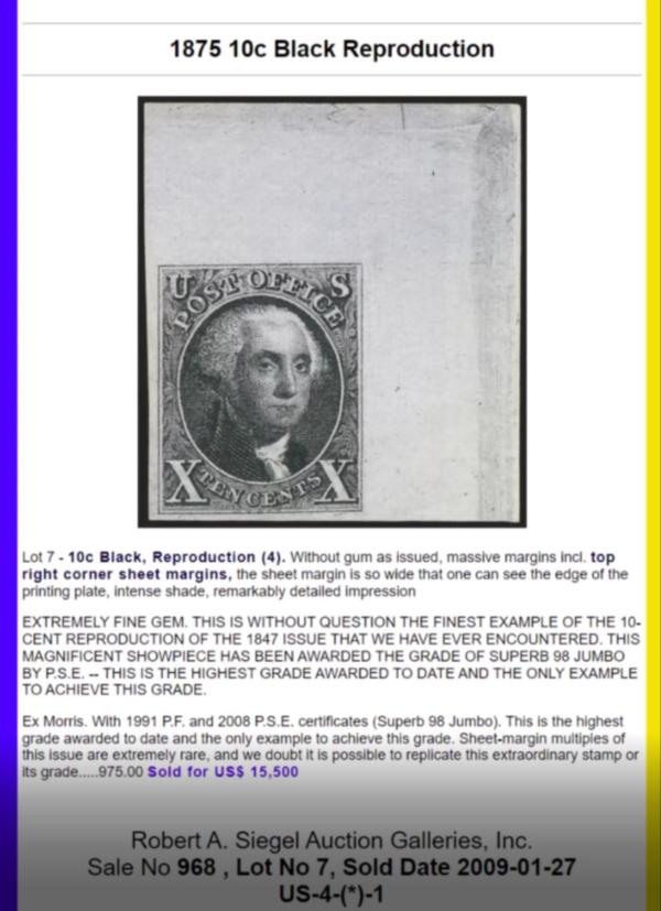 1875 10c Black Reproduction on Bluish paper without gum (4). Top 25 prices paid for examples in unused condition.