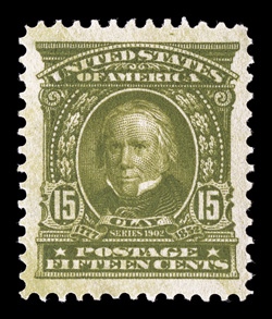 impression, o.g., lightly hinged, extremely fine  one of the largest m#309, 15c Olive green, marvelously well centered amid enormously large margins, the size of which is almost never encountered on any 1902 Issue, intense prooflike color and impression, o.g., lightly hinged, extremely fine; one of the largest margined #309's we have ever encountered; 2006 PSE certificate (XF-Superb 95 Jumbo; SMQ $590.00 for 95 and $1,200.00 for 98). (Image) $200.00