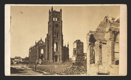 Barnard, is of the Cathedral...destroyed by the great fire 1861,Charleston: Photographs Two war-era carte-de-visite Photographs,, printed by JT Reading of Savannah, both described in pencil on verso. One, attributed to photographer George Barnard, is of the "Cathedral...destroyed by the great fire 1861," and the other of the "sister churches," Unitarian and Lutheran, with a man in a kepi in foreground, showing damage to the surrounding neighborhood. Second with a few spots, both with usual soiling and toning, but both sharp and VG. [2] (imagea) (Image) Est. $300-400