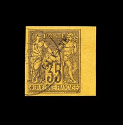2444 O 14 image#14, 1892 35c Black on orange, with "Guyane." ovpt., right sheet-margin single, other three margins large and even, strong color, light c.d.s. postmark, extremely fine; an especially handsome and select example of this rare stamp; signed Thier, Rendon (Yvert #12; FF 16,500). (Image) 1,600.00