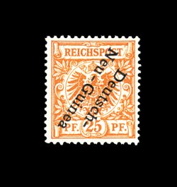 2448 og 5a image#5a, 1898 25pf Orange with inverted "Deutsch-/Neu-Guinea" overprint, very attractive mint single, well centered and with brilliant color, o.g., lightly hinged, extremely fine; as noted in Michel only one sheet of 100 was issued though this variety was not among the original issue that was sold across the counter; signed Bothe BPP and accompanied by his 1979 certificate (Michel #5K; €4,000). (Image) 2,750.00