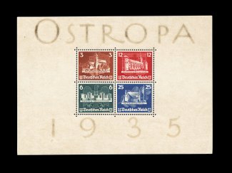2458 nh B68 image#B68, 1935 Ostropa souvenir sheet, still retaining its full original gum, which is most unusual (most sheets have had their gum removed), never hinged, trivial bend at bottom right, the gum as caused only one minor paper blemish at bottom left, very fine; the finest quality original gum example of this notoriously difficult souvenir sheet we have ever sold (Michel Block #3; €1,000). (Image) 650.00