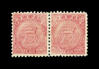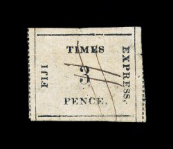 183 O imageS.G. #3, 1870 6p Black on rose "Fiji Times Express", used, showing roulettes on two sides, "#" cancel, thinned, fine appearance; 1992 BPA certificate (Scott #3; $2,750.00). (Image) £2,000
