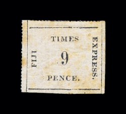 184 ng imageS.G. #4, 1870 1/- Black on rose "Fiji Times Express", unused, with full roulettes all around (a most unusual occurrence on the Fiji Times stamps), small faults as usual, very fine appearance; 1991 BPA certificate (Scott #5; $1,700.00). (Image) £1,500