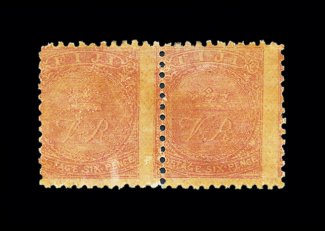 191 og imageS.G. #57a, 1899 6p rose, perforated 11, variety printed on both sides, mint horizontal pair, the print on the reverse in lighter but still quite clear, full fresh o.g. with just the faintest suggestion of hinging, fine; single examples of this error are quite elusive, but multiples are exceedingly rare; 1991 BPA certificate (Scott #43a; for hinged $1,800.00). (image 191a) (Image) £2,000+