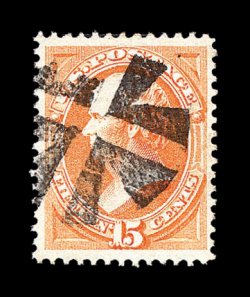 322 O image#163, 15c Yellow orange, extravagantly large and perfectly balanced margins all around, sumptuously rich color, boldly struck barred oval numeral "5" cancel, extremely fine; 1988 PF certificate. (Image) 125.00