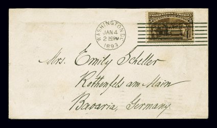 701 c 234 image#234, 5c Columbian, tied by Washington, D.C., Jan. 4, 1893 machine cancel on cover to Germany, very fine; a very early usage, being only the third day of use. (Image) Est. 200-300