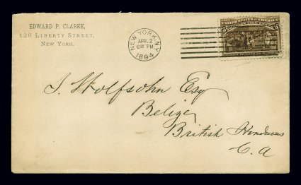 703 c 234 image#234, 5c Columbian, tied by New York, N.Y., Apr. 2, 1894 machine cancel on cover to Belize, British Honduras, New Orleans and Belize backstamps, very fine; an uncommon destination. (Image) Est. 150-200