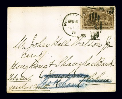 704 c 234 image#234, 5c Columbian, tied by New York, N.Y., April 13, 1893 duplex on small cover to Hong Kong and forwarded to Yokohama, Japan, San Francisco, Kong Kong and Yokohama backstamps, very fine (Scott #551 var.). (Image) Est. 150-200