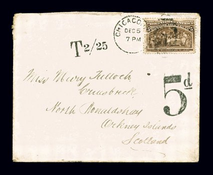 706 c 234 image#234, 5c Columbian, tied by Chicago Dec. 5 (1893) duplex on cover to Orkney Islands, Scotland, bold "5d" and "T2/25" postage due markings, Liverpool and Kirkwall backstamps, fine; a most unusual destination; ex-Gallagher. (Image) Est. 150-200