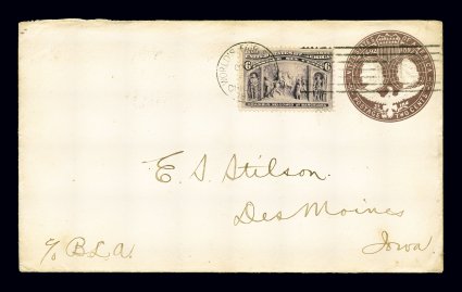707 c 235 image#235, 6c Columbian, tied by World's Fair Station, Oct 10, 1893 machine cancel (Bomar #C93-12) on 2c Columbian entire (#U349) to Iowa (backstamped), very fine. (Image) Est. 150-200