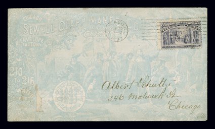 708 c 235 image#235, 6c Columbian, tied to blue all-over front and back advertising cover of Sewell-Clapp Manfg. Co. by Chicago Dec. 20, 1893 machine cancel, the illustration being the same as the vignette of the 2c Columbian stamp and "World's Columbian Exposition" seal in globe, imprint advertising on reverse, small light stain at bottom left of cover, otherwise very fine and scarce. (Image) Est. 200-300