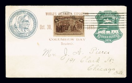 710 c 236 image#236, 8c Columbian, straight-edge at top, tied by World's Fair Station Oct. 30, 1893 machine cancel (Bomar #C93-12) on 3c Green Centennial entire (#U219) with Columbus Day imprint, addressed to J.A. Pierce, very fine. (Image) Est. 150-200