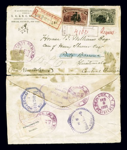 712 c 236, 237 image#236, 237, 8c and 10c Columbians, single of each cancelled by Newark, N.J. corks and tied by registry handstamp and label on registered cover to Guatemala, "Desconocido" label on reverse, as well as six different backstamps, the cover has been opened for display, the bottom edge was separated and rejoined with tape (now with hinges), resulting in some staining at bottom, still a fine and most interesting cover; ex-McCoy, Rosenthal. (imagea) (Image) Est. 200-300