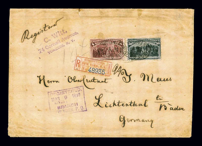 716 c 240 image#240, 50c Columbian, tied with 8c Columbian (#236) by Kingsbridge Stn., N.Y. oval pmks. on large registered cover to Germany, registry label also tied 8c, backstamped, cover with small faults, fine appearance; Scott catalog value $625.00. (imagea) (Image) Est. 200-300