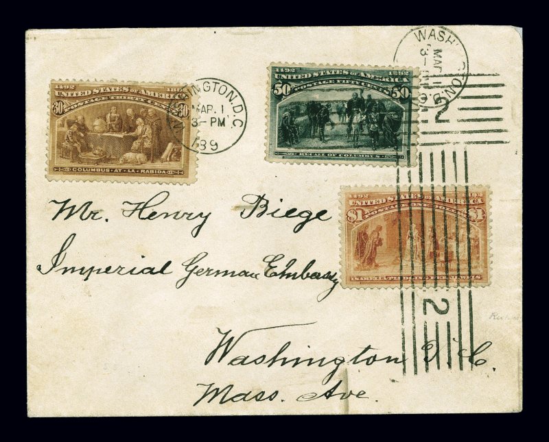 717 c 241 image#241, $1.00 Columbian, tied with 30c and 50c Columbians (#239, 240) by Washington, D.C., Mar. 1, 189? machine cancels on small local cover, 50c and $1.00 stamps with minor surface rubs, otherwise very fine; the $1.00 alone catalogs $2,000.00 on cover. (imagea) (Image) Est. 750-1,000