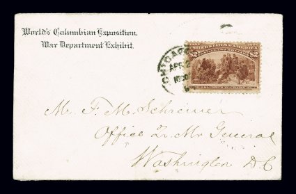 718 c 242 image#242, $2.00 Columbian, tied by Chicago c.d.s. on cover with "World's Columbian Exposition,/War Department Exhibit." corner card in blue, sent to Washington, D.C., fresh and very fine; catalogs $2,100.00. (Image) Est. 750-1,000