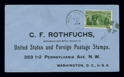 719 c 243 image#243, $3.00 Columbian, single with strong rich color tied by New Oxford, Pa, Dec 5, 1898 pmk. on blue cover addressed to C.F. Rothfuchs, quite fresh, very fine; signed H. Bloch; catalogs $2,600.00. (Image) Est. 1,000-1,500
