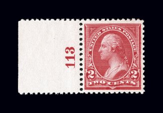 731 nh 250 image#250, 2c Carmine, Ty. I, select mint left sheet-margin plate no. 113 single that is exceptionally well centered within extravagantly large margins, dazzling bright color on fresh white paper, pristine o.g., n.h., extremely fine and striking; 2002 PF certificate. (Image) $77.50