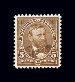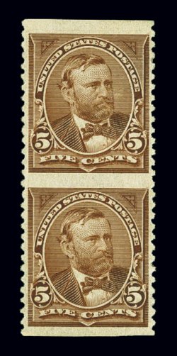 734 og 255c image#255c, 5c Chocolate, vertical pair, imperforate horizontally, a magnificent quality example of this very rare classic perforation error, being in a condition unlike any other we have ever seen, let alone offer in our auctions, as the majority of existing examples of this error are found with faults and/or very poorly centered, this pair does not suffer from either malady, being completely fault free and possessing near perfect centering within large margins, deep luxuriant color, o.g., lightly hinged, extremely fine; quite likely the finest example of this error rarity in existence; 2001 PF certificate. (Image) $4,000.00