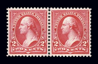 748 nh 266-267 image#266-267, 2c Carmine, Ty. II-III se-tenant combination pair, the left stamp being type II and the right stamp type III, remarkably well centered, gorgeous bright color on pristine white paper, unblemished o.g., never hinged, extremely fine; the Two Cent Bureau combination pair is quite scarce and greatly undercataloged, especially when found in this gem quality; 2005 PF certificate for a block of four, this being the bottom pair. (Image) $200.00