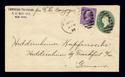 752 EDU 268 image#268, 3c Purple, tied by New York, Jan. 31, 1895 duplex on 2c Green entire to Germany, making this the earliest known usage of #268, (the current Scott catalog lists Feb. 18 as the EDU), stamp has been lifted and put back to verify the watermark, very fine; 2004 APS certificate specifically attesting to its EDU status. (Image) Est. 400-500