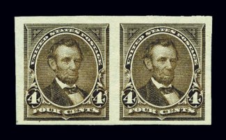 755 og 269a image#269a, 4c Dark brown, imperforate, horizontal pair, large margins all around, o.g., extremely fine. (Image) $275.00
