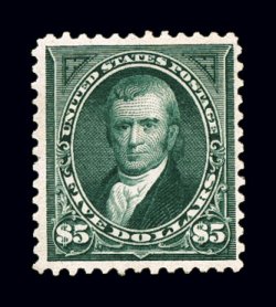 770 og 278 image#278, $5.00 Dark green, exceedingly well centered within unusually large margins, strikingly intense color and impression which contrast well with this stamp's bright fresh paper, full o.g., lightly hinged, extremely fine; an especially rare and challenging stamp in this premium condition; 1988 and 2000 PF certificate. (Image) $2,300.00
