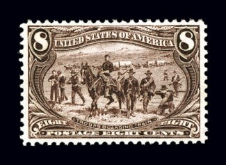 779 nh 289 image#289, 8c Trans-Mississippi, beautifully centered single, with larger margins than normally found on this difficult value, especially deep luxuriant color and an intense impression, o.g., n.h., trivial gum bends, extremely fine; clear 1998 PF certificate. (Image) $475.00