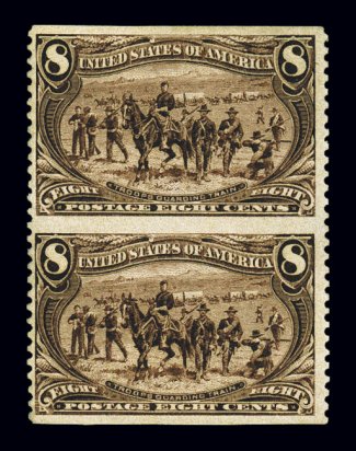 780 og 289a image#289a, 8c Trans-Mississippi, vertical pair, imperforate horizontally, quite well centered, strikingly intense color and impression, full o.g., very fine and choice. Only one sheet of of fifty stamps (twenty-five pairs) was ever found of this important classic era error rarity. Nearly all possess similar centering to this example. However, unlike a number of known pairs which have heavy gum creases and other faults, this particular pair is completely fault free and has full clean original gum. A rare opportunity to acquire one of the finest pairs of the Eight Cent Trans-Mississippi, imperforate horizontally, in existence. Accompanied by a 1997 PF certificate; ex-Floyd. (Image) $25,000.00