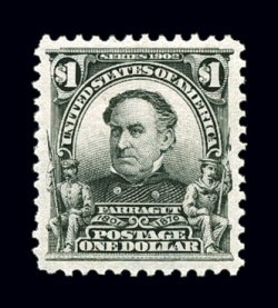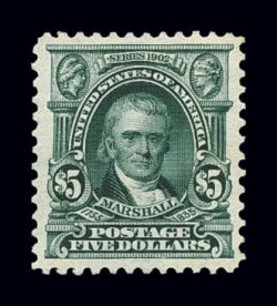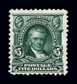 813 og 313 image#313, $5.00 Dark green, a most impressive mint example of this very scarce high value, possessing outstanding centering that is far superior to the vast majority, with large margins all around (a seldom seen occurrence on this stamp), sumptuously rich color and a crisp impression, o.g., lightly hinged, extremely fine; an especially desirable stamp in this gem quality; 2000 PF certificate. (Image) $2,900.00