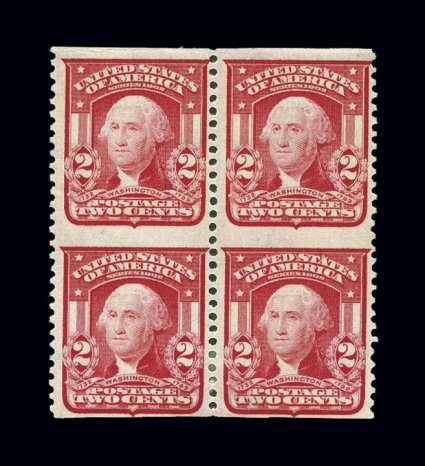 818 ogbl 319d image#319d, 2c Carmine, Ty. I, vertical pair, imperforate horizontally, mint block of four containing two such error pairs, being one of only two recorded blocks of four of this enormously rare error, quite well centered, deep luxuriant color, o.g., minor h.r. at bottom, very fine; according to Johl, the only examples of this error are from a block of 25, imperforate horizontally, that was found at the Washington, D.C. post office; one of the great error rarities of the 20th century and a highly important item for the 1902-03 Regular issue specialist; 1959 and 1998 PF certificates; cataloged simply as two pairs; ex-Floyd. (Image) $15,000.00+