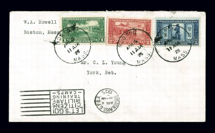 961 FDC 617-19 image#617-19, 1c-5c Lexington-Concord cplt., three different full-set first day covers, two from Boston, one with machine cancels and the other with unusual handstamp c.d.s. cancels with an inverted machine cancel at bottom left from putting the cover through the machine upside down, plus a Lexington cover with both flag machine and duplex cancels, three stamps with natural straight edges, very fine covers. (Image) $475.00