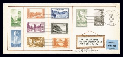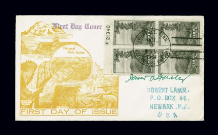 965 FDC 740-49 image#740-49, 1c-10c Parks cplt., set of ten on separate Ralph Dyer cacheted first day covers (Planty #7), each has a block of four (some with plate numbers), in addition each is signed by Postmaster James Farley, fresh and very fine; Farley signatures on first day covers are very scarce. (Image) Est. 400-500