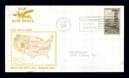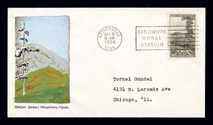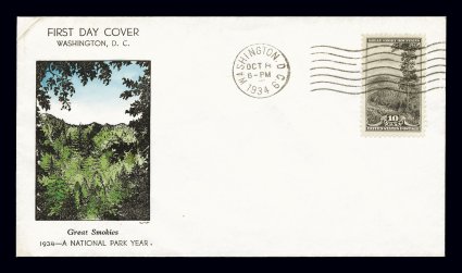 978 FDC 740/770 #740/770, 1c-10c Parks, valuable balance of an important specialized collection of first day covers, over 100 different, items, with many complete sets of the perforated issue, also some of the imperforate sets as well as the 1c and 2c souvenir sheets, nearly all are cacheted, including sets of Bates, Dyer, Parsons, Roessler, Top Notch, Roy, Grimsland, Anderson, Fairway, Open Book, Hubbard, Rice, Selby and many more, also some handpainted by Melissa Fox and others, plus there are full souvenir sheets, foreign destinations, complete sets on a single cover, a few USS Macon, etc., a few with light toning bands from the gummed envelope as often happens on these, but overall a very fine lot with many scarce cachets; the total retail value of this impressive holding will be many times our estimate. Est. 3,000-4,000