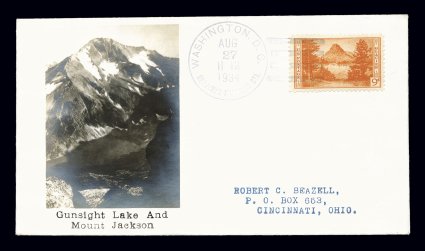 975 FDC 748 image#748, 9c Parks, on Beazell cacheted first day cover (Planty #15C), showing photograph of Gunsight Lake and Mount Jackson,very fine; a rarely seen cachet. (Image) Est. 300-400
