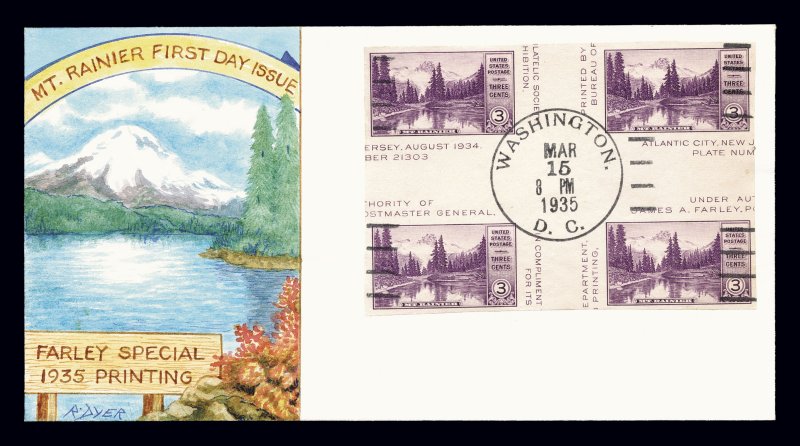 976 c 770a image#770a, 3c Parks imperforate tied to Fawcett cacheted cover by Mar. 8, 1935 Washington, D.C. duplex, cancelled seven days before the release of the reprints, proving that this was one of the original "Farley Follies", very fine; only a small number of these exist. (Image) Est. 300-400