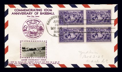 980 FDC 855 image#855, 3c Baseball, lot of fourteen cacheted first day covers, there are four examples of the Wesley White cachet (Planty #107; one hand-cancelled), others are all different, including three Crosby cachets, also included in the lot is one uncacheted FDC and two modern items, a very fine group of this popular first day cover. (Image) Est. 400-500