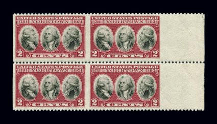 1000 og/nhbl 703c image#703c, 2c Yorktown, imperforate vertically, right sheet-margin block of four containing two error pairs, rich luxuriant color, o.g., top pair lightly hinged, bottom pair never hinged, very fine; an enormously rare error, especially in a block, this being the first example we have ever offered in any form. (Image) $11,250.00+