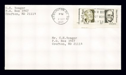 984 FDC 1862a image1862a, 20c Black, perf. 11.2, large block tagging, bottom left plate no. 2 single, tied to cover along with 5c Henna brown by "Washington, D.C./2 Sep 1988" machine cancel, this cover, serviced by Charles Yeager, is in fact a FDC for this variety perforated on the Eureka comb perforator after the line perforator was taken out of service, very fine; Charles Yeager was Linn's Washington correspondent in the 1980's and was often the only collector who learned when new varieties would be placed on sale, he made ten or fewer covers mailed to himself, Linn's and a small group of friends; an extremely rare FDC; American First Day Cover Society handstamp on reverse and accompanied by 1991 certificate of that society (as the earliest known usage because there was no official date for the variety, though this is a FDC). (Image) Est. 200-300