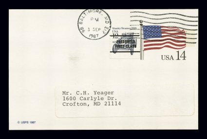 985 FDC 2132b image2132b, 12c Dark blue coil, Ty.II, untagged, Bureau pre-cancel, single tied to 14c Flag postal card by "Baltimore, MD/3 Sep 1987" machine cancel, this is anouther FDC serviced by Charles Yeager for an unannounced variety when this stamp was reformatted for the B press after the Conttrell press was taken out of service, this actually resulted in the change of the design, very fine; very rare with less than ten examples known; American First Day Cover Society handstamp on reverse and accompanied by 1991 certificate of that society (as the earliest known usage because there was no official date for the variety, though this is a FDC). (Image) Est. 200-300
