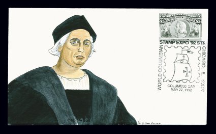 986 FDC 2624-29 image#2624-29, 1c-$5.00 Columbians cplt., set of sixteen values each on separate Jo Ann Bruce handpainted first day covers, World Columbian Expo. cancels, very fine; only six sets thought to be produced. (Image) Est. 200-300