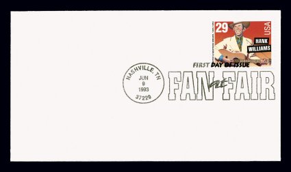 992 FDC 2723A image#2723A, 29c Hank Williams, perf. 11.2x11.5, single of this exceedingly scarce perforation tied to unaddressed, uncacheted FDC by special Nashville, TN first day cancel, very fine; this variety is listed but unpriced by Scott, their note implies that 2723A was produced on FDC as a matter of course, however this scarce perforation on first day cover is exceedingly rare, this being the only certified example of which we are aware; 2005 APS certificate. (Image) Est. 200-300