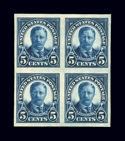 993 ogbl 557a image#557a, 5c Dark blue, imperforate, an exceptional quality mint block of four of this rare and seldom offered imperforate error, large and wonderfully well balanced margins, sumptuously rich color, o.g., lightly hinged, extremely fine; only one sheet of 100 stamps was printed imperforate, making blocks especially rare; 1991 PF certificate. (Image) $3,000.00+