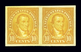 994 og 562b image#562b, 10c Orange imperforate, horizontal pair, unused, without gum as are all known examples, large balanced margins all around, brilliantly rich color, extremely fine; only two imperforate panes of 100 each were ever discovered, large areas on each were defaced in blue pencil by Bureau inspectors, leaving only approximately 40 to 50 unmarked pairs. (Image) $1,500.00