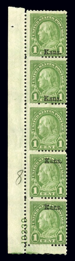 996 og 658a image#658a, 1c "Kans." ovpt., vertical pair, one without overprint, bottom left plate no. 19339 strip of five, with the middle stamp missing the overprint and the bottom two stamps with displaced overprints at the top, rich color, o.g. very slightly disturbed from hinge removals, fine; a very scarce and underappreciated error. (Image) $375.00+