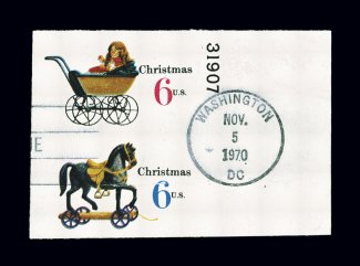 1022 O 1416c image#1416c, 6c Christmas toys, imperforate, used vertical se-tenant right-margin pair of #1416 and 1418, with plate no. 31907 in margin, Washington, D.C. machine cancel, light creasing which is immaterial considering this pair's unique status as a plate number pair, extremely fine; only one other pair has been recorded (a Mail Early slogan pair with the same postmark), in fact, this is the first time we have ever offered this error, as even the great William Floyd collection was missing this; 2001 PF certificate. (Image) $4,000.00